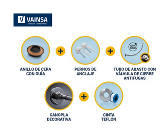 Kit de instalación: anillo de cera con guía, perno de anclaje, tubo de abasto con válvula de cierre antifugas, canopla decorativa, cinta teflón