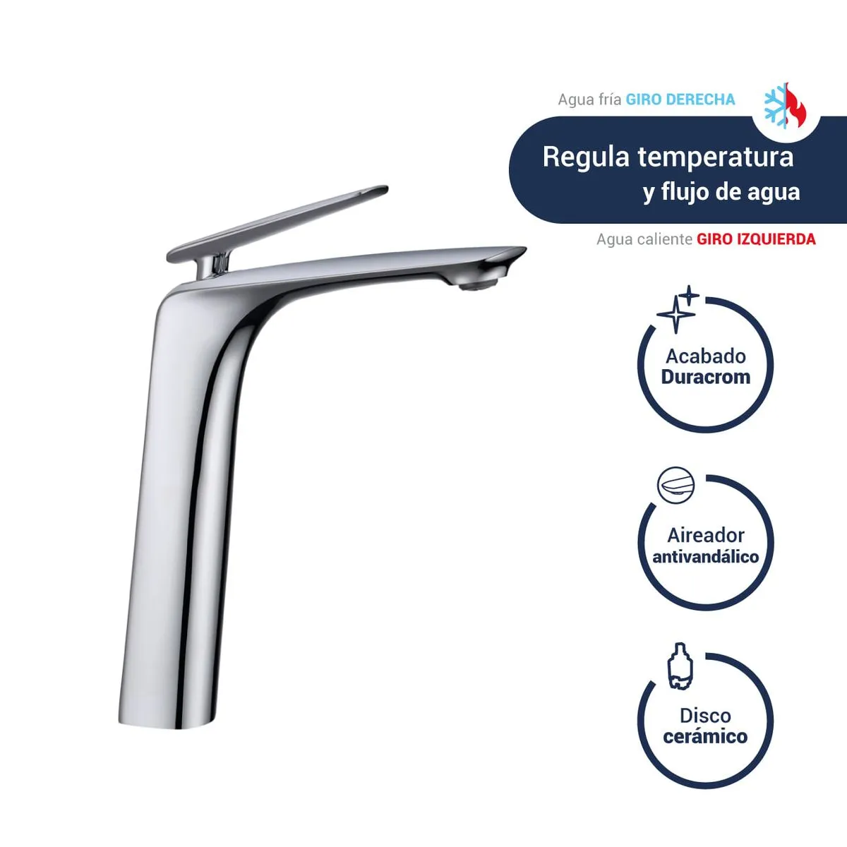 » Mezcladora monocomando alto de lavatorio, modelo Cosmopolitan, con acabado “duracrom” exclusivo de Vainsa que asegura la estética y acabado del producto con el paso del tiempo.