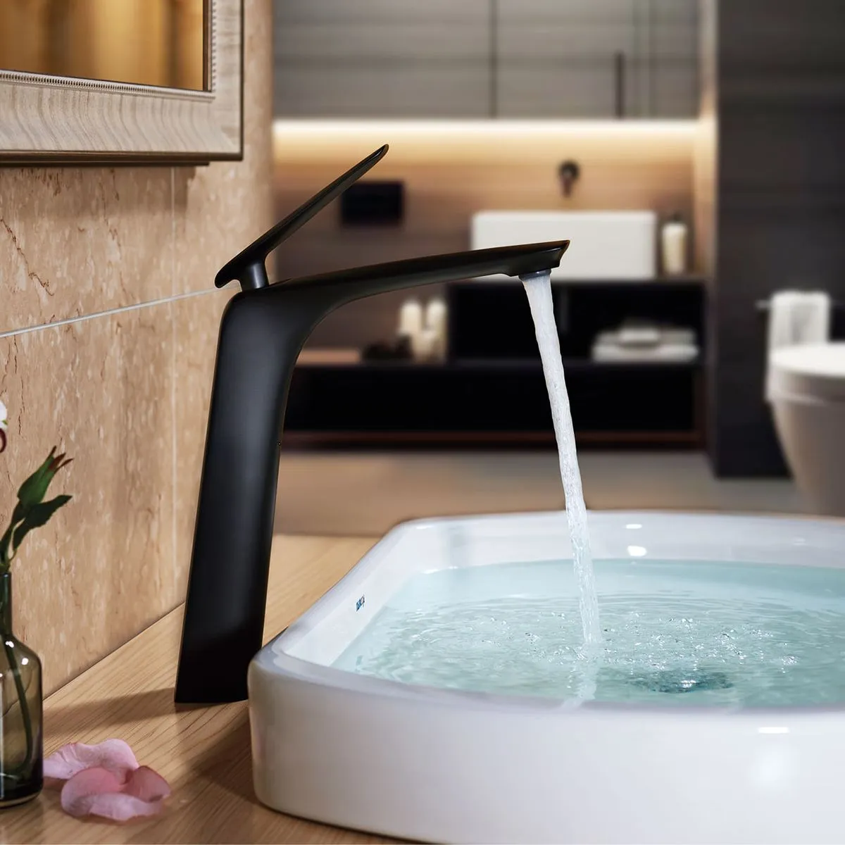 » Mezcladora monocomando alto de lavatorio, modelo Cosmopolitan, con acabado black matte exclusivo de Vainsa.