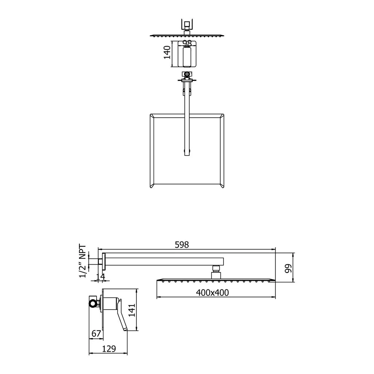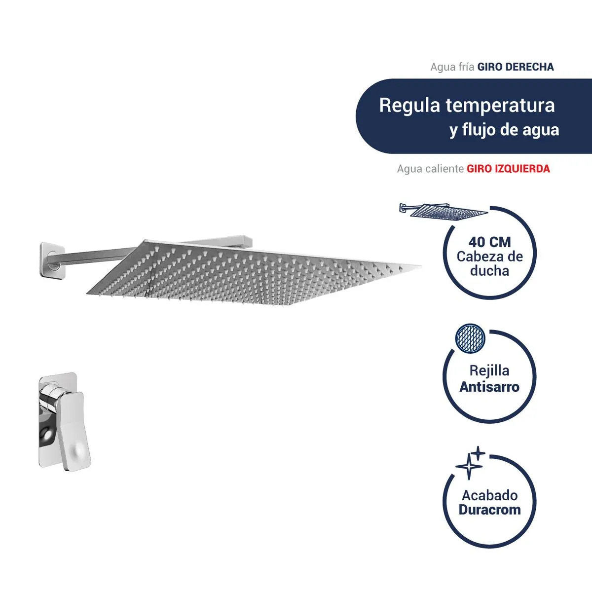 ✅ Cartucho cerámico de 35 mm para control preciso. ✅ Ducha cuadrada cromada de 40 cm. |