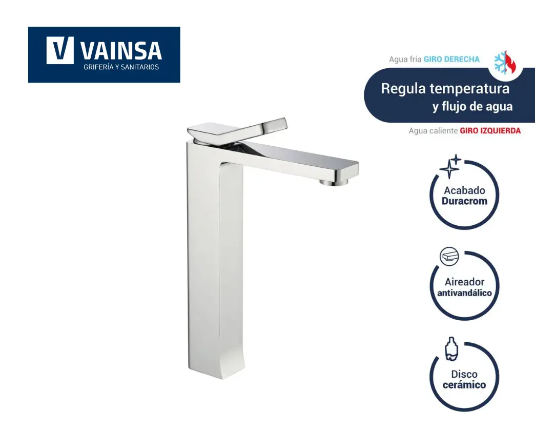 » Mezcladora monocomando alta de lavatorio, modelo Manhattan, con acabado “duracrom” exclusivo de Vainsa que asegura la estética y acabado del producto con el paso del tiempo.