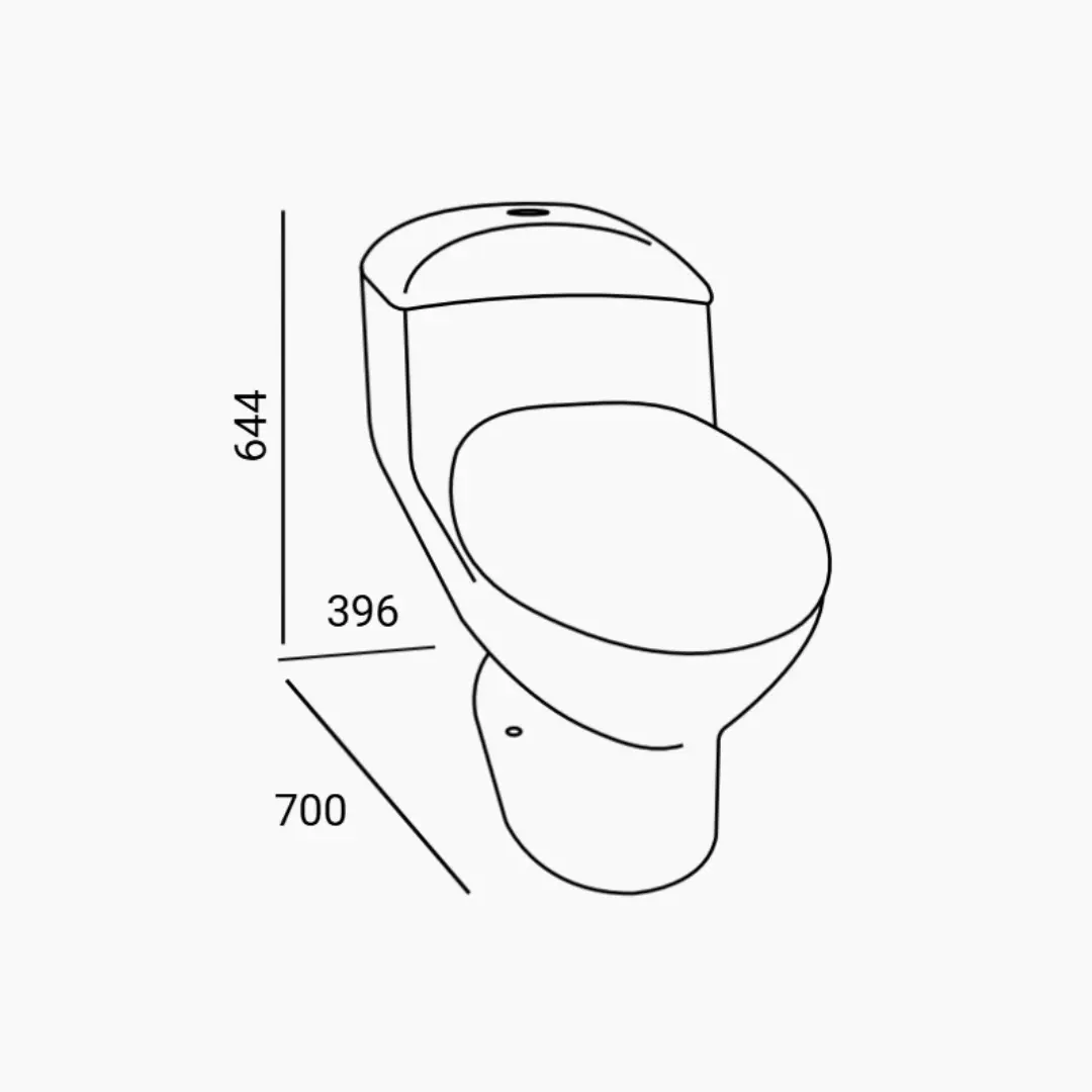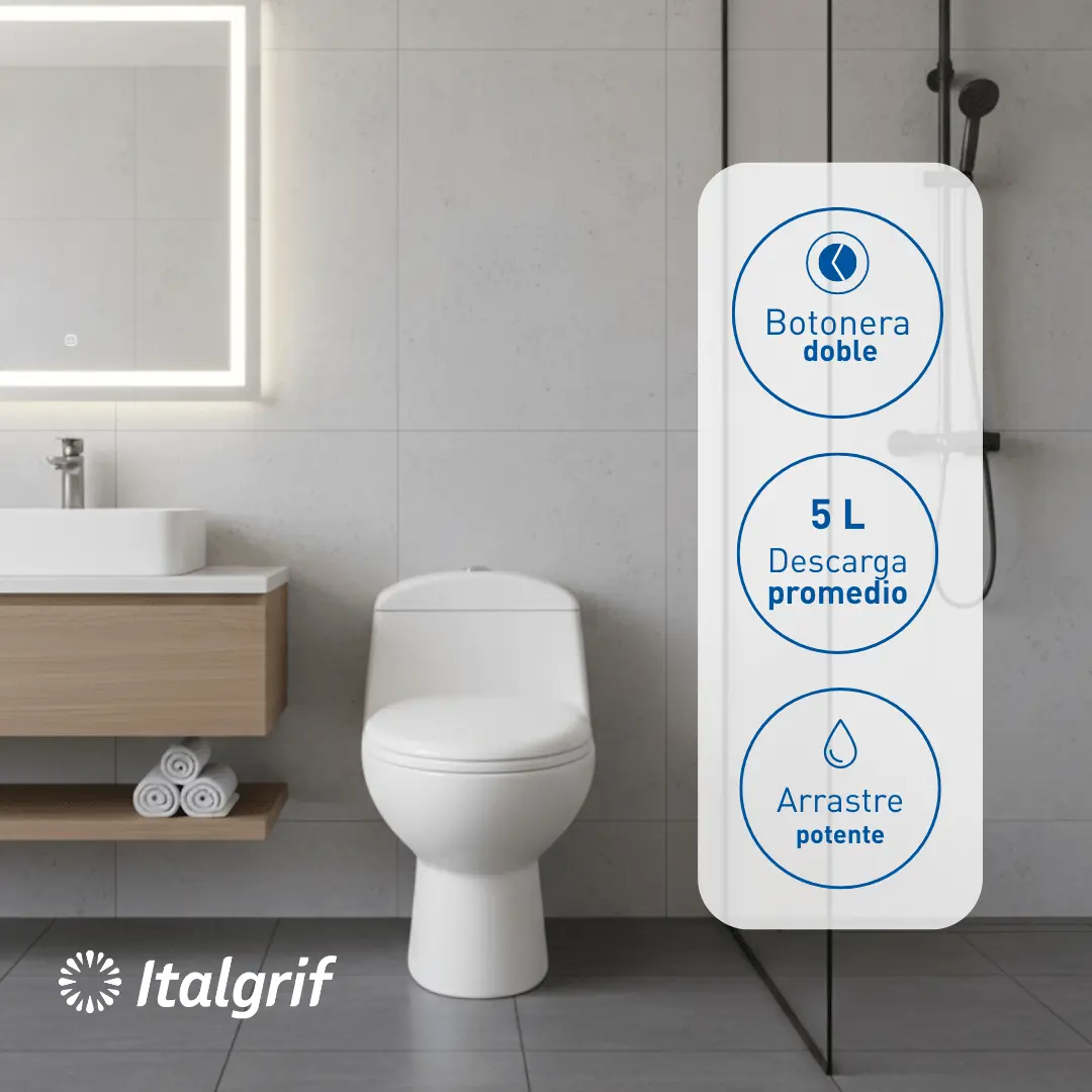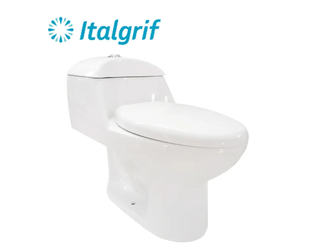 Inodoro One Piece con descarga dual 6L/4.5L, loza vitrificada y asiento de caída lenta. Durable, moderno y eficiente para optimizar el consumo de agua.