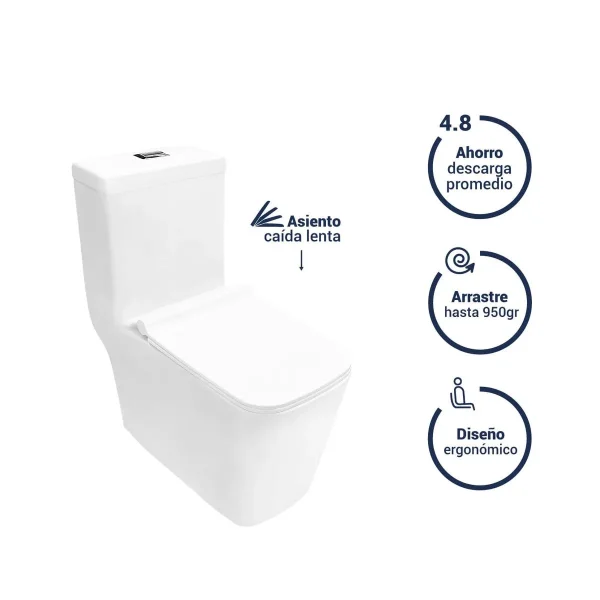 El inodoro de la colección Manhattan está fabricado en loza vitrificada, garantizando un funcionamiento eficiente y duradero. Su asiento con caída lenta evita golpes y daños, mientras que la botonera rectangular cromada dual añade un toque de elegancia.